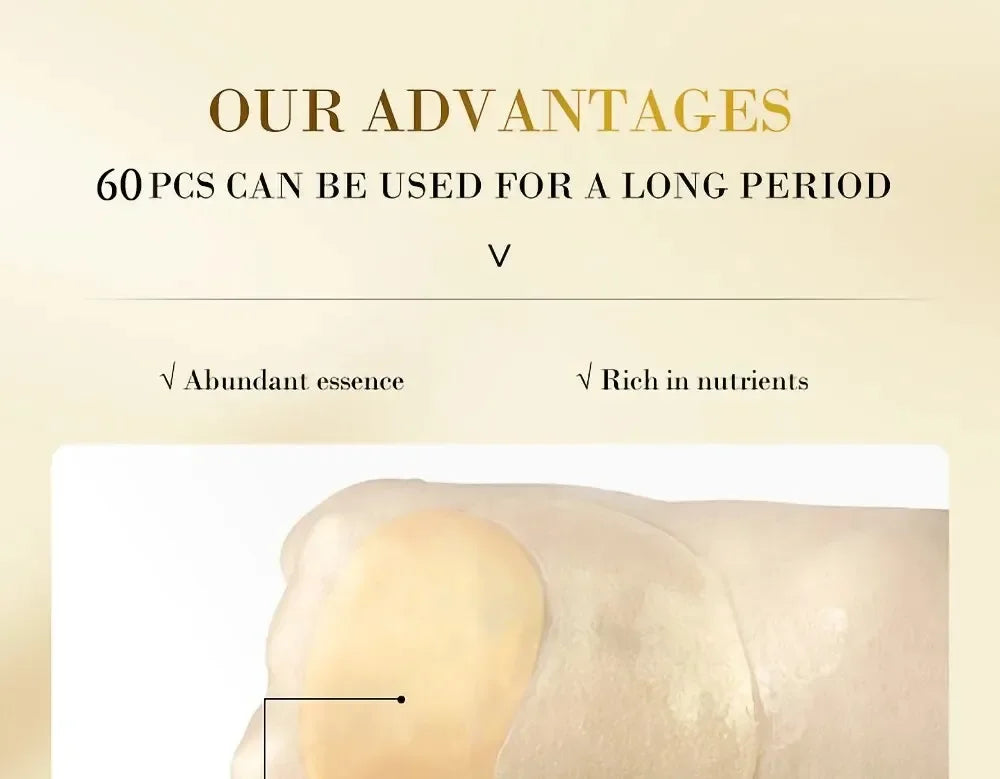 Refresh tired eyes and restore youthful radiance with these golden collagen eye masks. Infused with hydrating and firming ingredients, they deeply nourish the delicate under-eye area, helping reduce puffiness, fine lines, and dryness for smoother, brighter-looking skin.